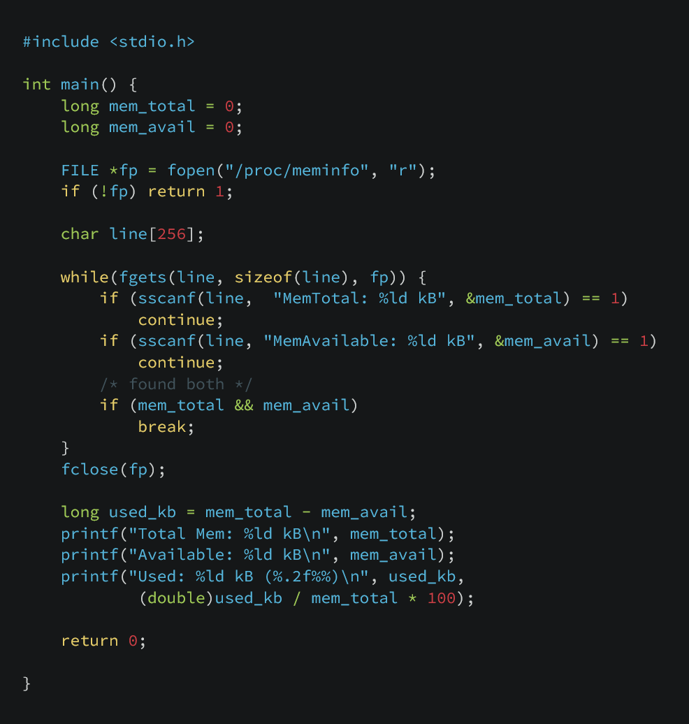 Luckily reading memory usage is fairly straightforward. No messing about with time deltas. We just need to open the /proc/meminfo file.