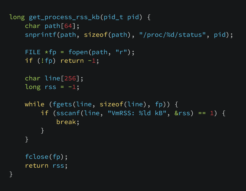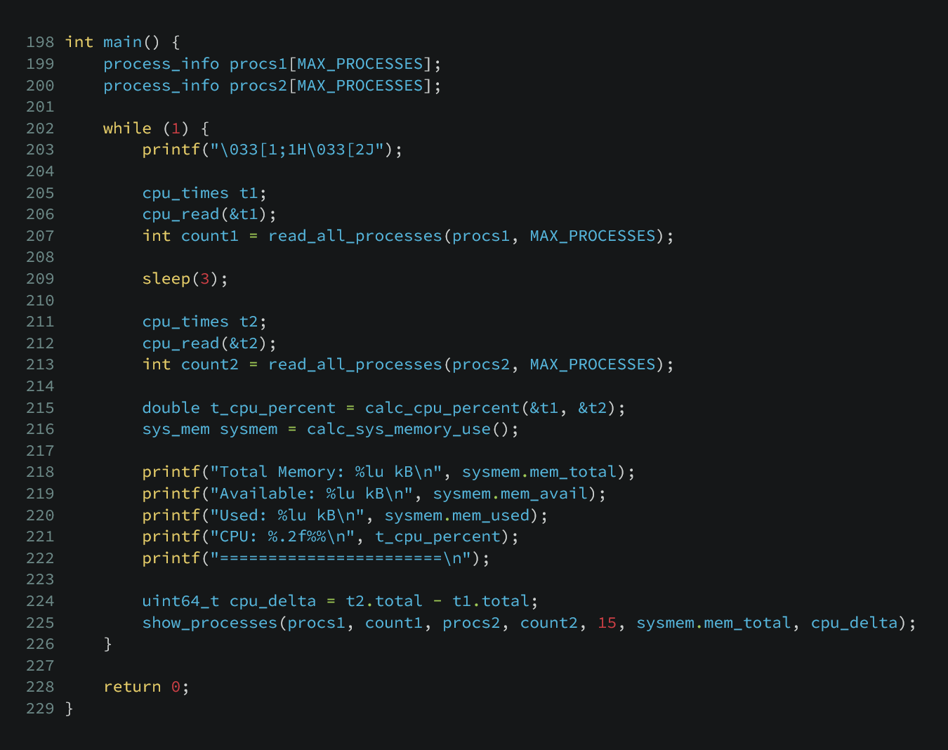 We can take the functionality of these small programs and bring them together to write mini-top, a simplified version of top. The top command is a real-time process monitor for Linux that displays a live, updating view of system resource usage. Our version should list system CPU & memory use, all running processes sorted by cpu usage, with each process displaying its PID, memory usage, and cpu usage. For the sake of this article, we will keep all the code in one c file. Full code available here.