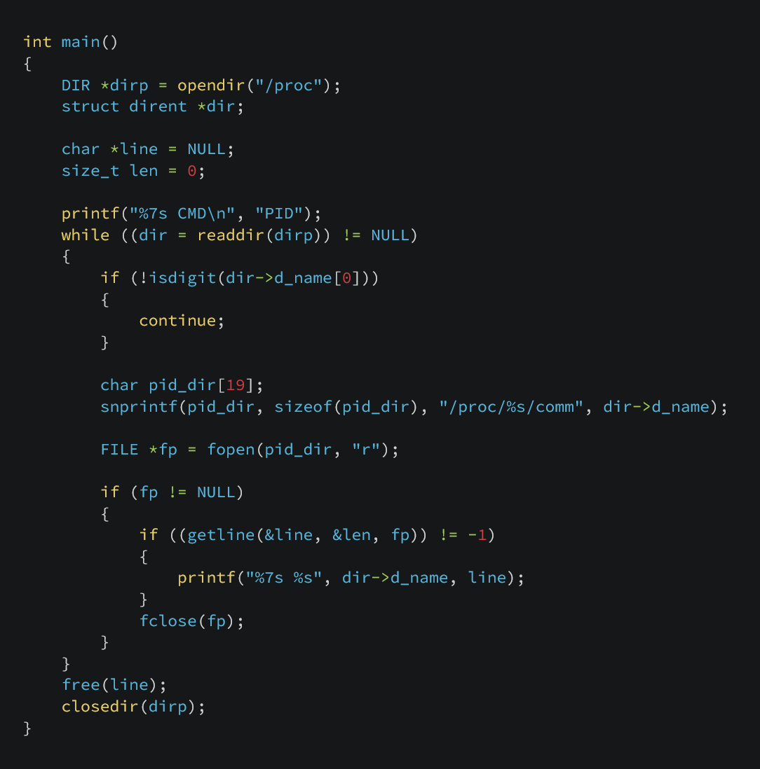 Knowing this, we can write a small program that produces an output similar to ps -e by walking the /proc directory directly.
