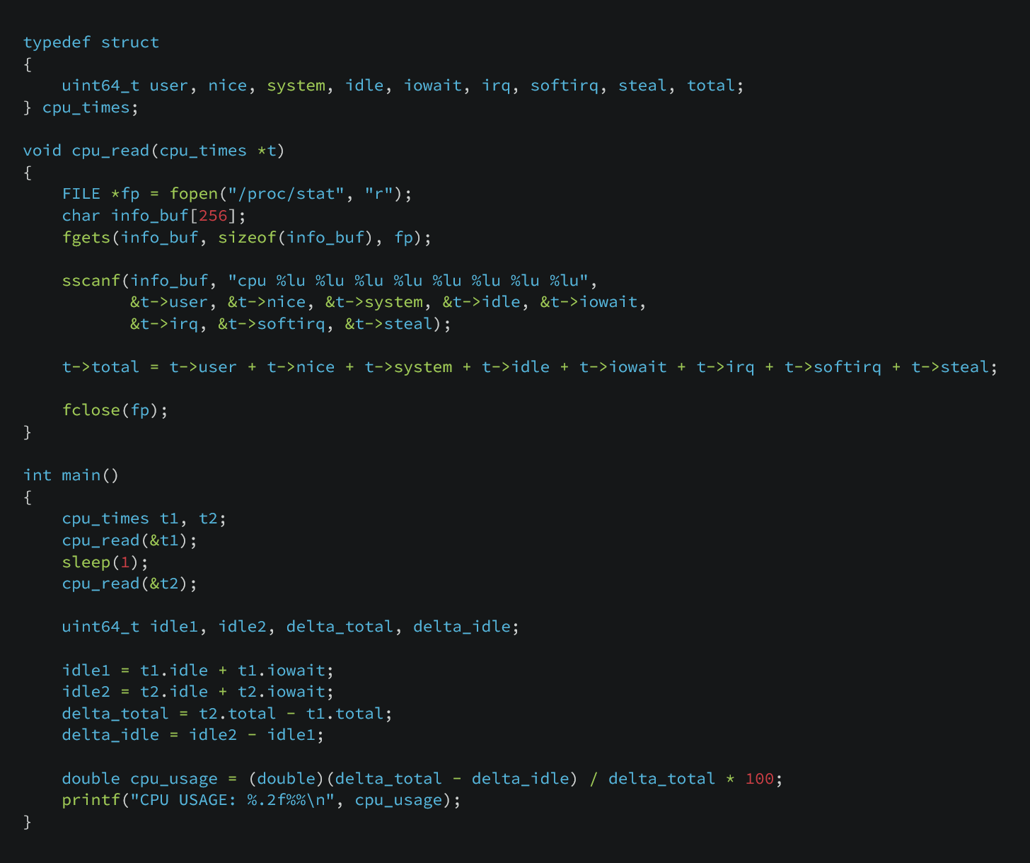 We start by taking a snapshot of /proc/stat, storing the CPU time fields and summing them to obtain the total number of jiffies. We then sleep for one second and take a second snapshot.
